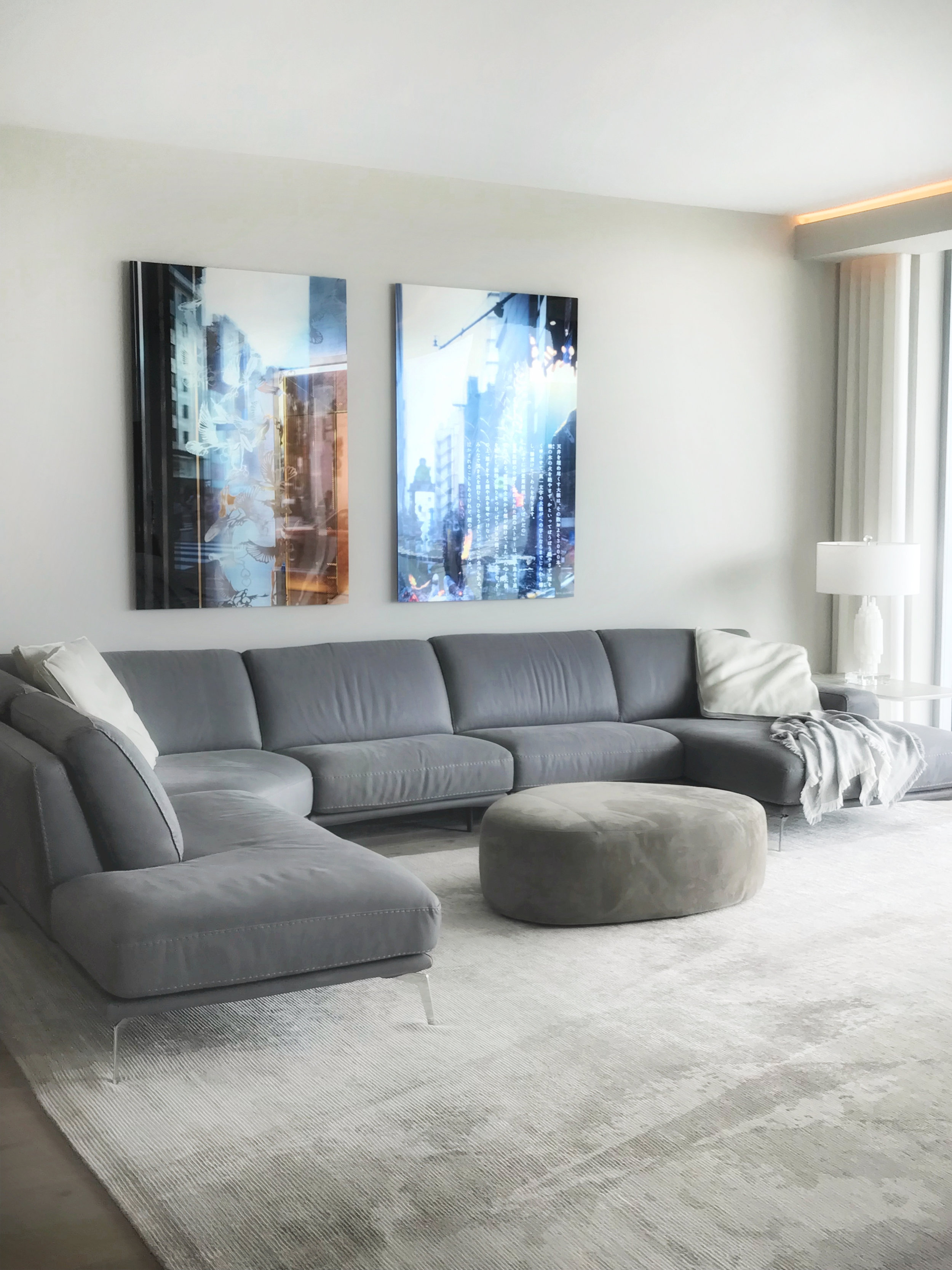 Installation of two 40x60 metal panels from Paris and Milan, in a condo at The Vue, Sarasota.